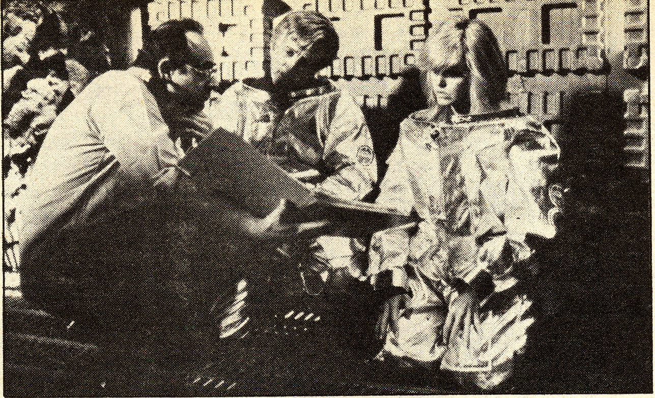 Camera operator David Harcourt BSC confers with Farrah who is holding a toy dog as a lighting stand in for the real dog Sally. Note that Farrah is wearing a cardigan - must get cold on Saturn 3.