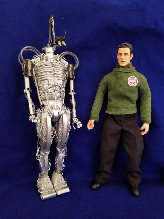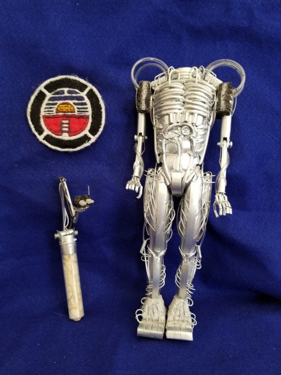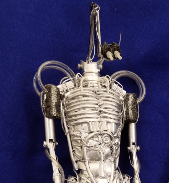 Randall explains how he created Hector, “About 30 years ago while my dad was recovering in the hospital from surgery, I noticed all the discarded syringes and iv tubing in the biohazard box. So I took it. Using a generic male action figure, I stitched the tubing through the soft body to create the texture. The arms are made out of small syringes for upper arm and the needle caps for the lower. A large syringe is the brain cylinder. The long thin hollow cleaning wands are chopped up and threaded with wire for the hands and the neck, two unpainted portions are the eyes. Finally, the same wire was used for some surface texture. Foam blocks were used for the shoulders, feet and head. Then all was painted silver.”