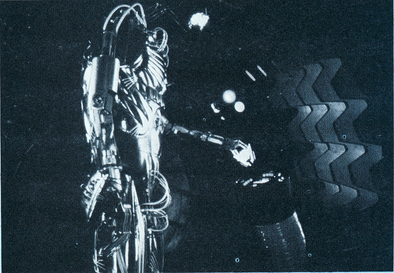 Hector drags his maker’s body away in a reversal of his namesake’s fate in the original legend of Achilles. This production still is notable in that it is a rare rear view of the robot’s anatomical design.