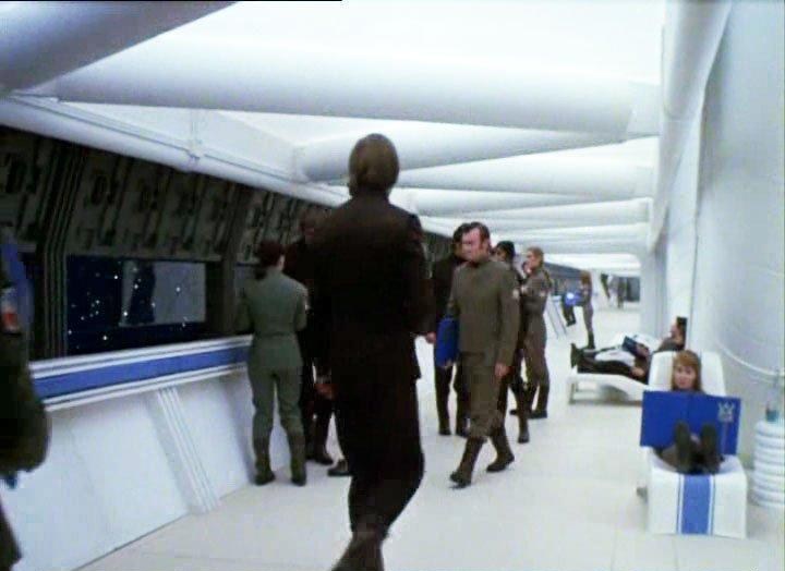 A rare wide shot of Alex watching from the promenade deck of the World Spaceways ship. (courtesy cinema.de)