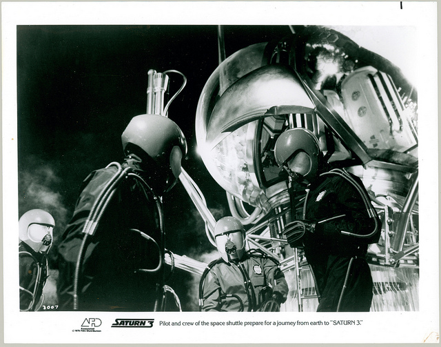 Saturn 3 lobby card – shuttle Published November 6, 2012 at 640 × 503 in picture gallery (164) ← Previous Next → Benson’s shuttle prepares for launch (please note: this lobby card is wrongly captioned. The shuttle launches from the space station in orbit around Saturn and not the Earth) Saturn 3 One of the many “B” movies of the late seventies. Like Loading...